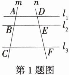 1.「2025 湖北武汉硚口月考」如图,已知直线 $ l _ { 1 } // l _ { 2 } // l _ { 3 } $,直线 $ m $、$ n $ 分别与直线 $ l _ { 1 } $、$ l _ { 2 } $、$ l _ { 3 } $ 交于点 $ A $、$ B $、$ C $、$ D $、$ E $、$ F $,若 $ D E = 3 $,$ E F = 5 $,则 $ \frac { A B } { B C } $ 的值为(