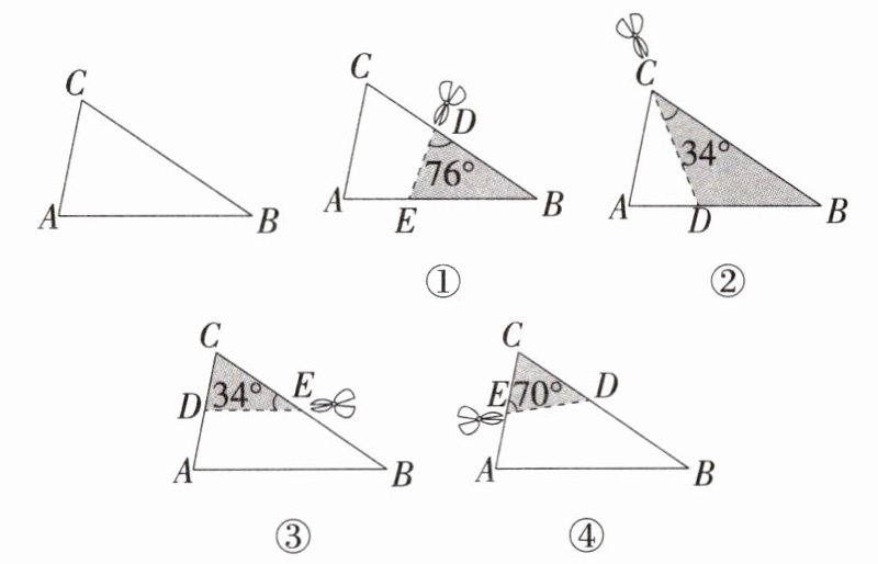 3. 新考向 实践操作题 [2024河北乐亭期末] 如图,在$\triangle ABC$纸片中,$\angle A = 76^{\circ}$,$\angle B = 34^{\circ}$。将$\triangle ABC$纸片沿某处剪开,下列四种方式中剪下的阴影三角形与原三角形相似的是(