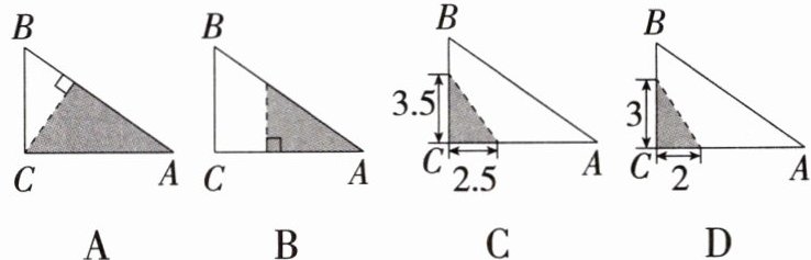 1.「2025 山东枣庄市中期中」在$\triangle ABC$纸片中,$∠ACB = 90^{\circ}$,$BC = 5$,$AC = 7$,将该纸片沿虚线剪开,剪下的阴影三角形与原三角形不相似的是( )