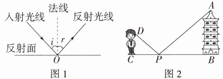 【问题解决】如图2,小亮在P处放置一面平面镜(平面镜的大小忽略不计),他站在C处通过平面镜恰好能看到塔的顶端A,此时测得小亮到平面镜的距离CP为4米.已知平面镜到塔底部中心的距离PB为247.5米,小亮眼睛到地面的距离DC为1.6米,C,P,B在同一水平直线上,且DC,AB均垂直于CB.请你计算塔的高度AB.