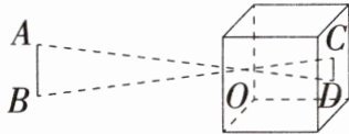 2. 跨物理 小孔成像 学科教材变式 素养P108习题T2 「2025河南南阳期中」为了证明光沿直线传播这一性质,大约在二千四百年前,我国杰出的科学家墨翟和他的学生做了世界上第一个小孔成像的实验,解释了小孔成倒像的原理.如图所示的是小孔成像原理的示意图,$AB$为蜡烛,$CD为蜡烛AB$在暗盒中所成的像,若$6 cm长的蜡烛AB在暗盒中所成的像CD的长是1 cm$,$AB与小孔O之间的距离为18 cm$,则小孔$O到像CD$的距离为(