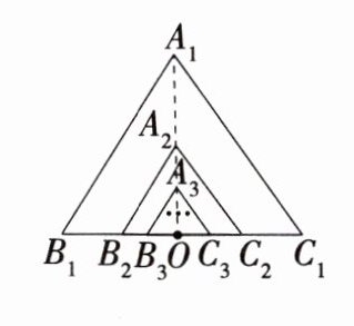 10. 新抽象能力 新规律探究题 如图所示,正三角形$A_1B_1C_1$,正三角形$A_2B_2C_2$,正三角形$A_3B_3C_3$,……$$,正三角形$A_nB_nC_n$位似,其中$\triangle A_1B_1C_1$的边长为1,点$O是B_1C_1$的中点,$A_2是OA_1$的中点,$A_3是OA_2$的中点,……$$,$A_n是OA_{n - 1}$的中点,顶点$B_2$,$B_3$,…$$,$B_n$,$C_2$,$C_3$,…$$,$C_n都在边B_1C_1$上.