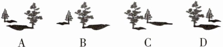 D 选项A,B,两棵小树的影子的方向相反,不可能为同一时刻阳光下的影子,所以A,B选项错误;选项C中较高的小树影子短,较矮的小树影子长,不符合在同一时刻阳光下,树高与影子成正比,所以C 选项错误;选项D,在同一时刻阳光下,影子方向相同,树高与影长成正比,所以D选项正确.故选D.