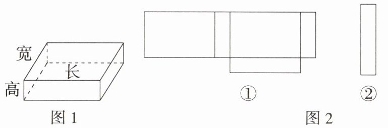 5. 新课标 新考向 空间观念 动手操作题 「2024河南平顶山宝丰期中」小志在学习了“展开与折叠”后,明白了很多几何体都能展开成平面图形,于是他在家用剪刀把一个长方体纸盒(如图1)剪开,多剪了一条棱,把纸盒剪成了两部分,即图2中的①和②。根据你所学的知识,回答下列问题: