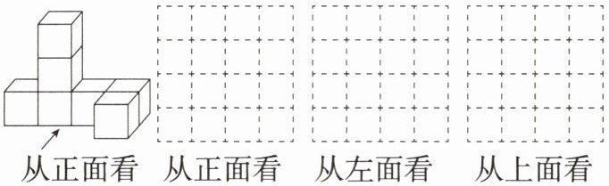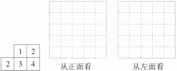 5.「2023江西吉安吉州期末」一个几何体由一些大小相同的小正方体搭成,如图所示的是从上面看到的几何体的形状图,小正方形中的数字表示在该位置的小正方体的个数,请在网格中画出从正面和左面看到的几何体的形状图。