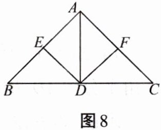 11. 已知:如图8所示,AD是$\triangle ABC$的角平分线,$DE\bot AB$,$DF\bot AC$,垂足分别是E、F,$BD= CD$,求证:$\angle B= \angle C$。