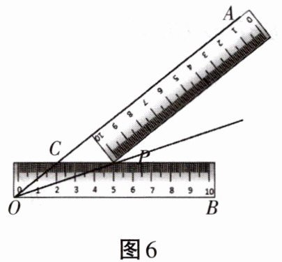 9. 如图6所示,小明将两把完全相同的长方形直尺放置在$\angle AOB$上,两把直尺的接触点为P,边OA与其中一把直尺边缘的交点为C,点C、P在这把直尺上的刻度读数分别是2、5,则OC的长度是______。