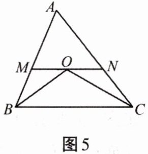 8. 如图5所示,已知BO平分$\angle CBA$,CO平分$\angle ACB$,$MN// BC$,且过点O,若$AB= 12$,$AC= 14$,则$\triangle AMN$的周长是______。