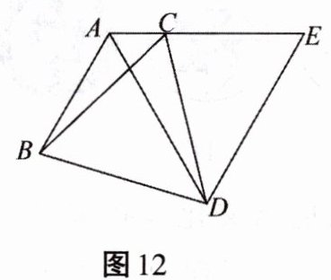 14. 如图12所示,$\triangle ABC$中,$∠BAC= 120^{\circ }$,以BC为边向外作等边$\triangle BCD$,把$\triangle ABD$绕着D点沿顺时针方向旋转$60^{\circ }后到\triangle ECD$的位置. 若$AB= 3$,$AC= 2$,求$∠BAD$的度数和AD的长.