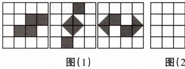 (在图(2)的网格中,以网格中心为对称点,画出一个由4个小正方形组成的中心对称图形,例如:在中心小正方形的左上角、右上角、右下角、左下角分别选取一个小正方形涂黑,形成十字交叉外的对称图案)所画图案为由4个小正方形构成的中心对称图形,且不存在对称轴。