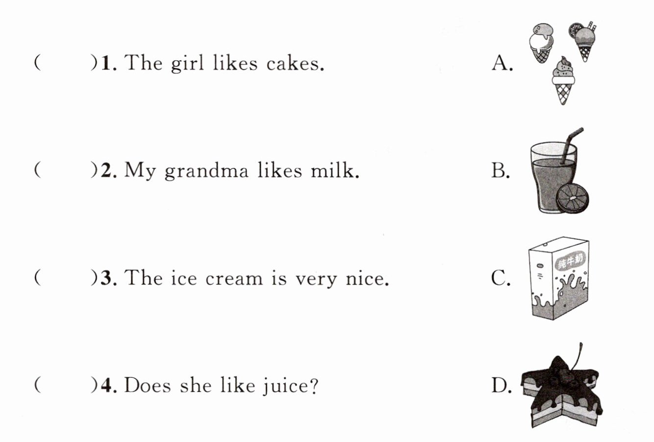 )4. 佳佳喜欢牛奶,美美说自己也喜欢牛奶,她可以说:____A. I like it too. B. I like them all.