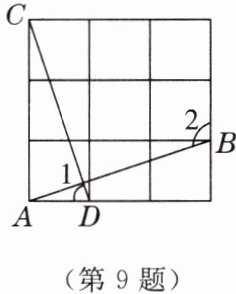 9. 如图,在边长为 1 的小正方形组成的网格中,给出以下结论:①$AB = CD$;②$AB\perp CD$;③$\angle 1与\angle 2$互补,其中正确的是