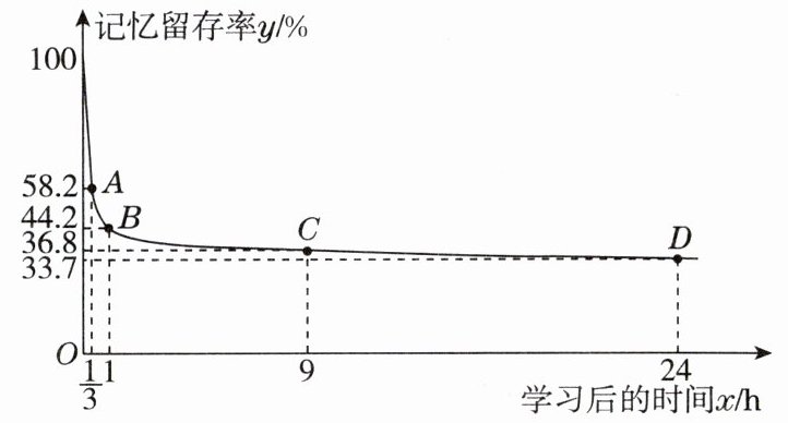 (3)点D的实际意义是学习后第24小时,记忆留存率为33.7%.