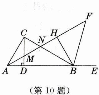 10. 如图,在△ABC中,$\angle ACB = 90^{\circ}$,$CD\perp AB$于点D,AN是角平分线,延长AN交△ABC的外角$\angle CBE$的平分线BF于点F,H为AF上一点,且$\angle FBH = 45^{\circ}$,则下列结论:①$\angle CMN= \angle CNM$;②$BH\perp AF$;③$\angle NCD = 2\angle HBN$,其中正确的是(