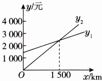 1. 某公司准备和 $ A,B $ 两家出租车公司中的一家合作. 已知 $ A,B $ 两家出租车公司的收费 $ y_{1} $(元)、$ y_{2} $(元)与行程 $ x(km) $ 的关系如图,若行程大于 $ 2500\ km $,则选择