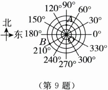 9. 如图,一艘船在 $ O $ 点探测到目标 $ A $ 的位置为 $ (2,90^{\circ}) $,用方位角和距离可描述为:在点 $ O $ 正北方向,距离 $ O $ 点 2 个单位长度。小明和小美分别用两种方式表示目标 $ B $ 的位置,小明:目标 $ B $ 的位置为 $ (4,300^{\circ}) $;小美:目标 $ B $ 在点 $ O $ 的南偏东 $ 30^{\circ} $ 方向,距离 $ O $ 点 4 个单位长度。下列判断正确的是(