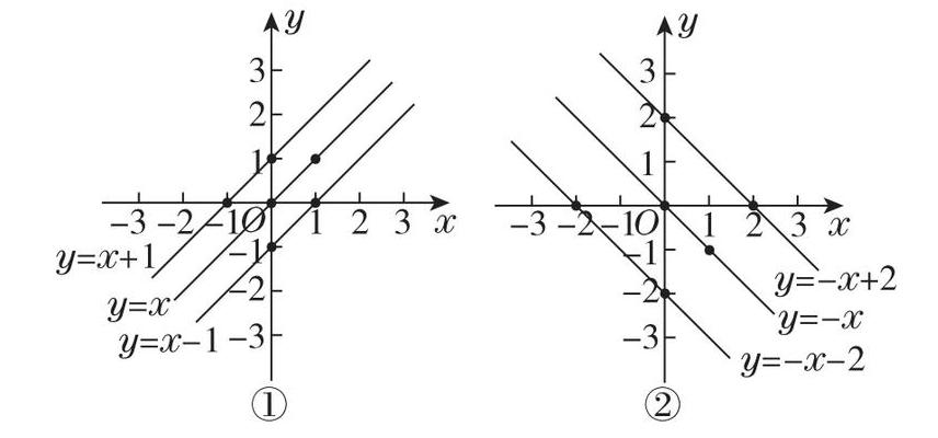 同理,第二组函数$y=-x-2$,$y=-x$,$y=-x+2$的斜率$k=-1$也相同,而截距$b$不同,所以这三个函数的图像也是三条互相平行的直线,