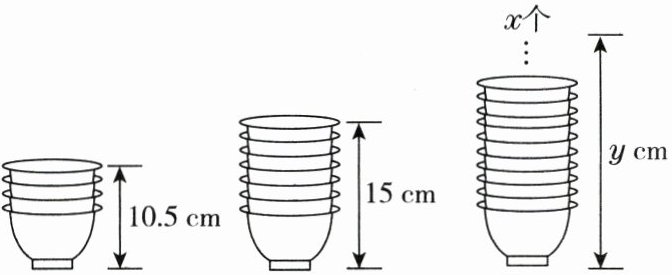 (2)y=6+(x-1)×1.5=1.5x+4.5,1m=100cm,当y=100时,1.5x+4.5=100,解得x=191/3,因为191/3不是整数,所以这摞碗的高度不能是1m.