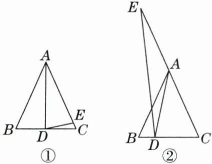 (1) 如图①,点 $ E $ 在线段 $ AC $ 上。①若 $ \angle BAC = 42^{\circ} $,$ \angle DAE = 30^{\circ} $,则 $ \alpha = $