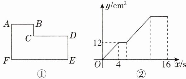 8. 如图(图①中各角均为直角),动点 P 从点 A 出发,以每秒 1 cm 的速度沿 $ A \to B \to C \to D \to E $ 的路线匀速运动,三角形 AFP 的面积 $ y $($ cm^{2} $)与点 P 运动的时间 $ x $(s)之间的函数图象如图②所示,则 CD 的长度为