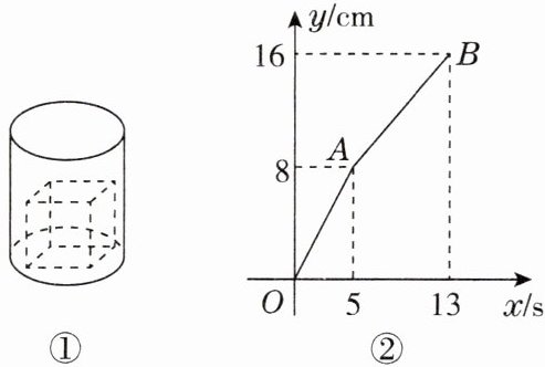 9. 如图①,一个正方体铁块放置在圆柱形水槽内,现以一定的速度往水槽中注水,13 s 时注满水槽,水槽内水面的高度 $ y $(cm)与注水时间 $ x $(s)之间的函数图象如图②所示.