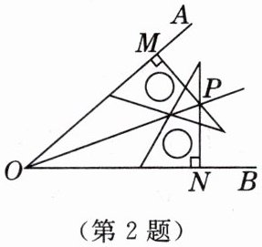 2. 如图,在$\angle AOB$的两边 $OA$,$OB$ 上分别取 $OM = ON$,再分别过点 $M$,$N$ 作 $OA$,$OB$ 的垂线,两垂线交点为 $P$,画射线 $OP$,则根据