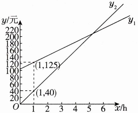 5. [2025年1月扬州期末]暑假期间,学校准备组织青岛研学游,计划第二天到甲、乙两个租车公司租用新能源汽车去中山公园看樱花.甲公司:按日收取固定租金105元,另外再按租车时间计费;乙公司:无固定租金,直接以租车时间计费,每小时的租金是40元.设租车时间为x h,租用甲公司的车所需费用为$y_{1}$元,租用乙公司的车所需费用为$y_{2}$元,其关系如图所示.