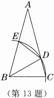 13. 如图,在$ \triangle ABC $中,以点$ B $为圆心,$ BC $长为半径画弧,分别交$ AC $,$ AB 于 D $,$ E $两点,连接$ BD $,$ DE $,若$ \angle A = 30^{\circ} $,$ AB = AC $,则$ \angle BDE $的度数为