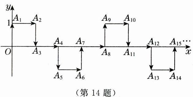 14. 如图,在平面直角坐标系中,点$ P 从原点 O $出发,按$ O \to A_1 \to A_2 \to A_3 \to A_4 \to A_5 \to A_6 \to A_7 \to A_8 …\to \to A_n $依次不断移动,每次移动1个单位长度.