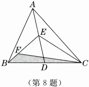 8. 如图,在$ \triangle ABC $中,$ AD 是 BC $边的中线,$ E 是 AD $的中点,点$ F 在 BE $上,且$ EF = 2BF $.若$ S_{\triangle BCF} = 2\ cm^2 $,则$ S_{\triangle ABC} = $(