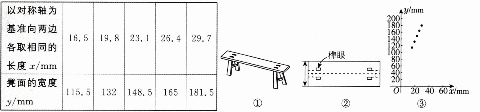 (2)把y=213代入y=5x+33,得5x+33=213,解得x=36,所以当凳面宽度为213 mm时,以对称轴为基准向两边各取相同的长度是36 mm.