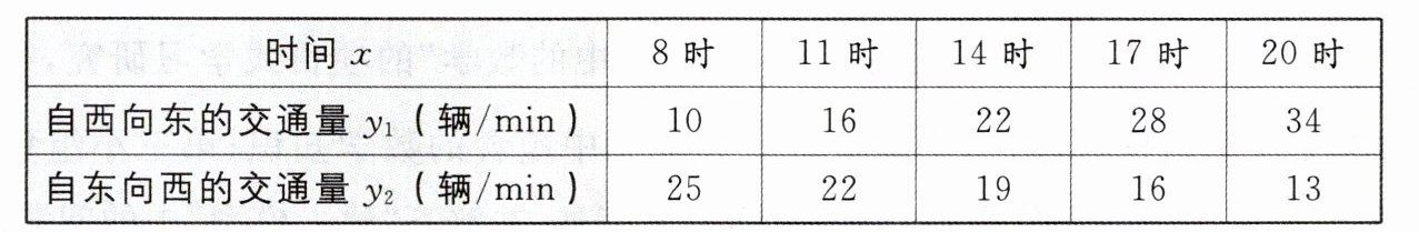 2. [中考趋势·探究建模 2025·天津模拟]某条东西方向道路双向共有三条车道,在早晚高峰时段经常出现拥堵现象,某数学小组对该路段的交通量(单位:辆/min)和时间进行了统计和分析,相应数据如下表所示,并发现交通量和时间的变化规律符合一次函数的特征,其中$y_{2}= -x+33$.