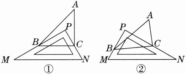 (3) 变式探究:如图②所示,将图①中$\triangle ABC$的形状改变,同时改变三角尺的位置,使点$P在\triangle ABC$外,三角尺的两边$PM,PN仍恰好分别经过点B$、点$C$,探究$∠ABP,∠ACP,∠A$之间的数量关系.