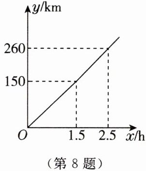 8. 在“十一”黄金周期间,乐乐一家自驾游去了离家 $ 260 km $ 的某地,如图是他们离家的距离 $ y $($ km $)与汽车行驶时间 $ x $($ h $)之间的函数图象,乐乐一家出发 $ 2.3 h $ 时,距离目的地还有(