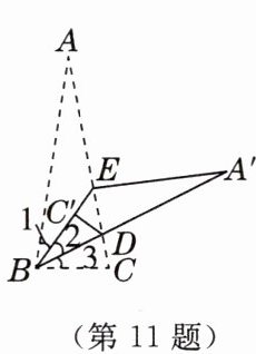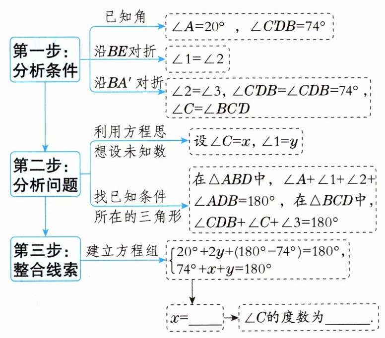 11.思维可视化如图,在$△ABC$中,$∠A= 20^{\circ }$,沿BE对折此三角形,又沿$BA'$再一次对折,使点C落在BE上的点$C'$处,此时$∠C'DB= 74^{\circ }$,如何求原三角形中$∠C$的度数?