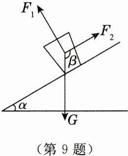 9.[2024·山西中考]一只杯子静止在斜面上,其受力分析如图所示,重力G的方向竖直向下,支持力$F_{1}$的方向与斜面垂直,摩擦力$F_{2}$的方向与斜面平行.若斜面的坡角$α=25^{\circ }$,则摩擦力$F_{2}$与重力G方向的夹角β的度数为(
