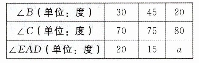上表中$a = $____,猜想:$\angle EAD与\angle B$,$\angle C$的数量关系为____。