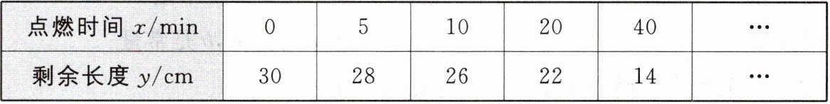 2. 点燃的蜡烛每分钟燃烧的长度一定,下表记录了点燃时间$ x(min) $与剩余长度 $ y(cm) $之间的部分数据:[教材P28例3变式1]