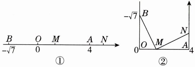 15. 创新题·新考法 如图①,数轴上从左至右依次有B,O,M,A,N五个点,其中点B,O,A表示的数分别为-√7,0,4.如图②,将数轴在点O左侧的部分绕点O顺时针方向旋转90°,将数轴在点A右侧的部分绕点A逆时针方向旋转90°,连接BM,MN.若△OBM和△AMN全等,则点M表示的数为