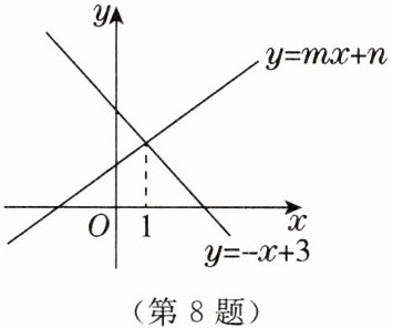 8. 如图,直线$y = - x + 3与y = m x + n$交点的横坐标为1,则关于$x$,$y的二元一次方程组\begin{cases}x + y = 3, \\ - m x + y = n\end{cases} $的解为
