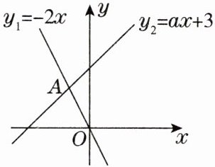 6. 如图,函数$y _ { 1 } = - 2 x与y _ { 2 } = a x + 3的图象相交于点A ( m, 2 )$,则关于$x的不等式组- 2 x > a x + 3 > 0$的解集是(