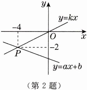 2. 如图,函数$y = ax + b和y = kx的图象交于点P$,根据图象,可得关于$x$,$y的二元一次方程组\begin{cases}ax - y + b = 0, \\ kx - y = 0\end{cases} $的解是(
