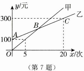 7. 随着暑假临近,某游泳馆推出了甲、乙两种消费卡,设消费次数为$x$时,所需费用为$y$元,且$y与x$的函数关系如图所示. 根据图中信息判断,下列说法错误的是(