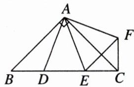 5. 如图,在$△ABC$中,$∠BAC = 90^{\circ}$,$AB = AC$,点 D,E 是边 BC 上的点,$∠DAE = 45^{\circ}$,将$△ABD$绕点 A 逆时针旋转$90^{\circ}得到△ACF$,连接 EF。