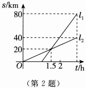 2. $ A $,$ B $ 两地相距 $ 80 $ km,甲、乙沿同一条路从 $ A $ 地到 $ B $ 地. 如图所示,$ l_{1} $,$ l_{2} $ 分别表示甲、乙离开 $ A $ 地的距离 $ s $(km)与时间 $ t $(h)之间的关系,当甲、乙相遇时,他们离开 $ A $ 地