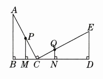 9. 分类讨论思想如图,点C在线段BD上,$AB⊥BD$于点B,$ED⊥BD$于点D,$∠ACE= 90^{\circ }$,且$AC= 5cm,CE= 6cm$,点P从点A开始以$2cm/s$的速度沿AC向终点C运动,同时点Q以$3cm/s$的速度从点E出发,沿$E→C→E$运动,当点P到达终点时,P,Q同时停止运动.过P,Q分别作BD的垂线,垂足分别为M,N.设运动的时间为t s,当以P,C,M三点为顶点的三角形与$△QCN$全等时,t的值为 (