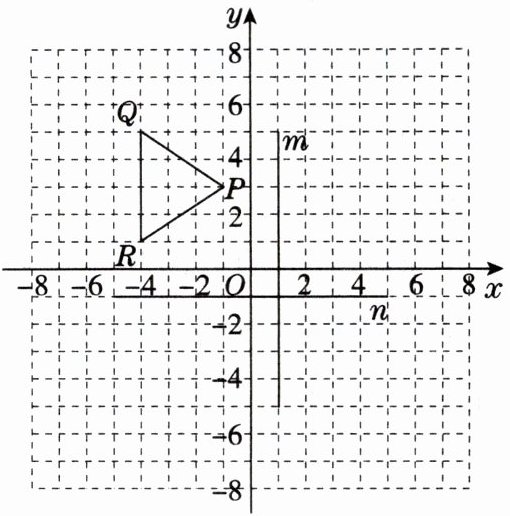 11. 如图,在平面直角坐标系中,$\triangle PQR的三个顶点分别为P(-1,3)$,$Q(-4,5)$,$R(-4,1)$,直线$m$上各点的横坐标都为1,直线$n$上各点的纵坐标都为-1。