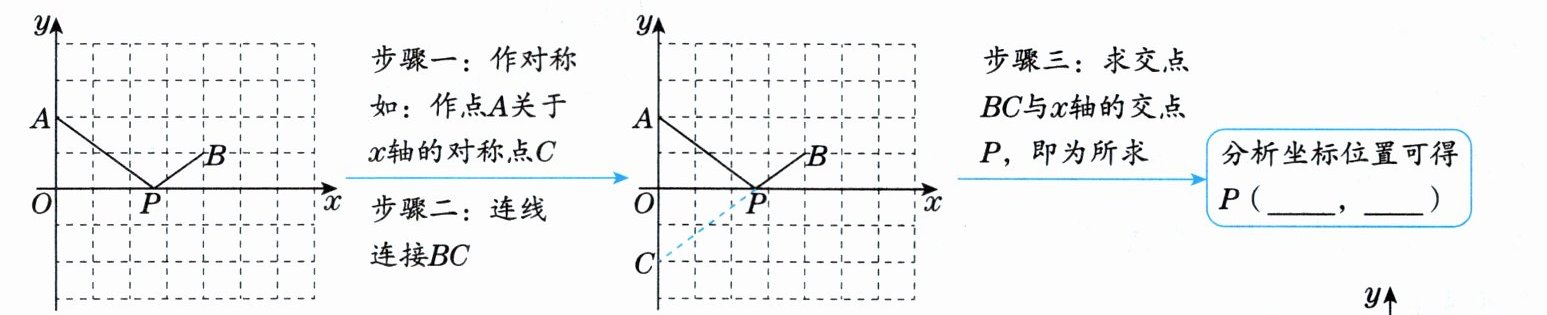 思维可视化如图,$A$,$B$两个城市需要从临近的一条河流引入水源,通过数学方法,建立了平面直角坐标系,单位长度为$1km$,$x$轴为河流,城市$A的坐标为(0,2)$,城市$B的坐标为(4,1)$,现在要在$x$轴(河流)上建造一座供水站$P分别向城市A$、$B$供水,使得输水管道总长度$PA+PB$最小,如何求$P$的坐标?