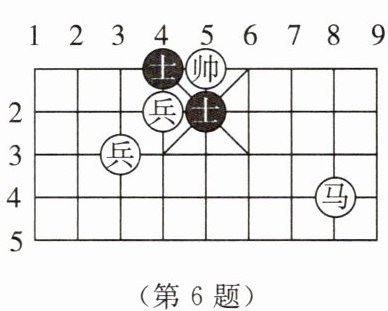 6. 观察如图所示的象棋棋盘,$(5,1)$表示“帅”的位置,马走“日”字,那么“马8进7”(即第8列的马前进到第7列)后的位置可表示为