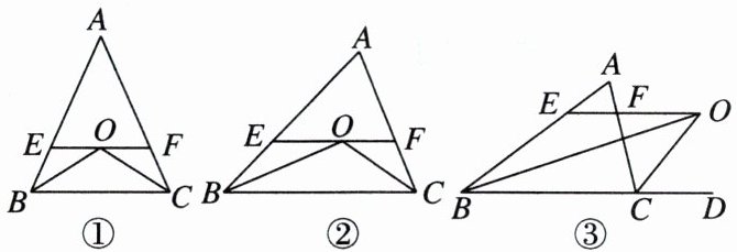 (4)【变式探究】如图③,在$\triangle ABC$中,若$AB\neq AC$,$\angle ABC的平分线与三角形外角\angle ACD的平分线CO交于点O$,过点$O作OE// BC交AB于点E$,交$AC于点F$,则$EF与BE$,$CF$间的数量关系为